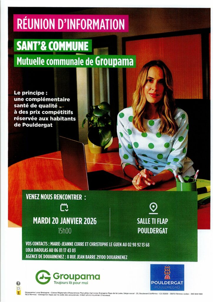 La commune a signé une convention avec GROUPAMA depuis 2022 afin de permettre aux habitants de Pouldergat de bénéficier d’une mutuelle communale au meilleur prix pour une couverture sociale complémentaire intéressante.